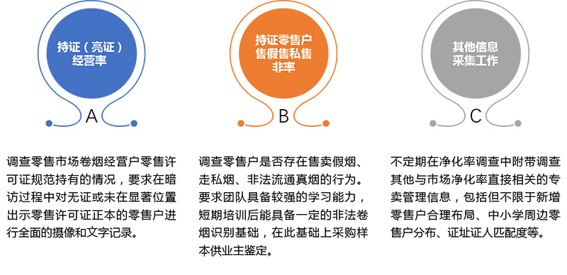 華夏經(jīng)緯根據(jù)區(qū)域經(jīng)濟、客戶分布、業(yè)態(tài)布局、卷煙銷量等因素,結(jié)合各地?zé)煵菔袌龅奶攸c,因地制宜為監(jiān)測區(qū)域構(gòu)建獨立的市場凈化率抽樣模型,科學(xué)、全面體現(xiàn)當(dāng)?shù)責(zé)煵菔袌鰞艋?。市場凈化率調(diào)查的主要內(nèi)容包括(不限于)持證(亮證)經(jīng)營率和持證零售戶售假售私售非率等信息。
