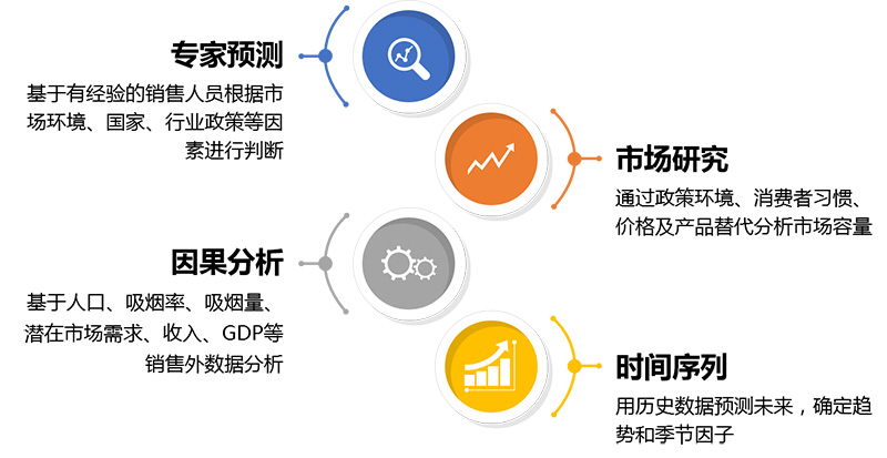 華夏經(jīng)緯在多年服務(wù)國內(nèi)煙草行業(yè)的經(jīng)驗基礎(chǔ)上,對市場容量推算和預(yù)測有著成熟的理解,在實操中將融合常見的幾種市場容量預(yù)測模型。