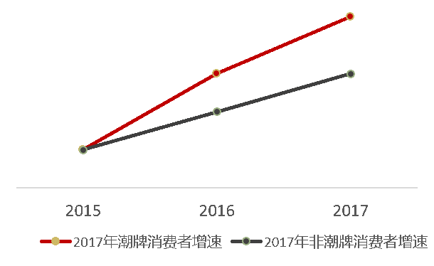 (3)2017年起,潮牌服裝市場規(guī)模增長迅速,潮牌消費增速是非潮牌的3.7倍。增長速度達(dá)到62%,而非潮牌消費增速是17%。潮牌的消費者數(shù)量增幅完勝非潮牌。