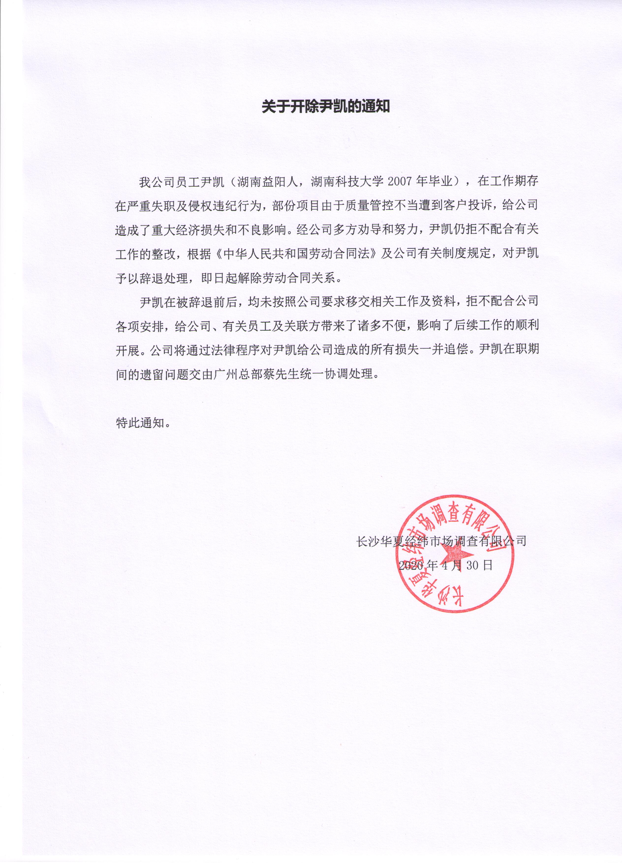 我公司員工尹凱(湖南益陽人,湖南科技大學2007年畢業(yè)),在工作期存在嚴重失職及侵權違紀行為,部份項目由于質量管控不當遭到客戶投訴,給公司造成了重大經濟損失和不良影響。經公司多方勸導和努力,尹凱仍拒不配合有關工作的整改,根據(jù)《中華人民共和國勞動合同法》及公司有關制度規(guī)定,對尹凱予以辭退處理,即日起解除勞動合同關系。