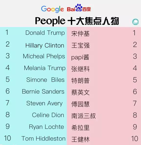 隨著美國大選的落下帷幕,特朗普、希拉里順理成章地也收獲了來自全世界的注視,成為Google人物榜和百度十大焦點人物榜中惟二上榜的政界人士。